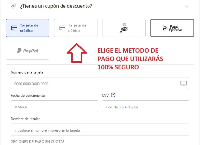 Puedes realizar tu pago dando clic en el botón comprar, puedes pagar con tarjeta de crédito, débito, PayPal, Oxxo, Pagos en efectivo, Efecty y transferencia bancaria.